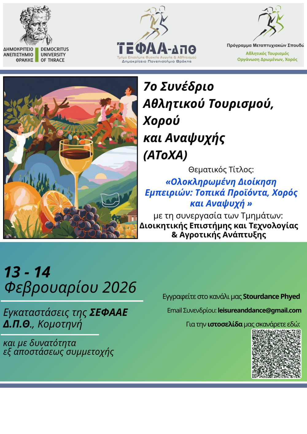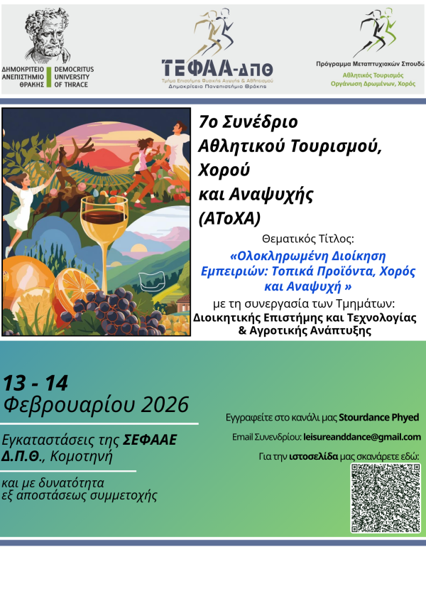 Το Μεταπτυχιακό Πρόγραμμα Σπουδών «Αθλητικός Τουρισμός, Οργάνωση Δρωμένων, Χορός» της Σ.Ε.Φ.Α.Α.Ε. του Δ.Π.Θ. διοργανώνει συνέδριο με στόχους:
